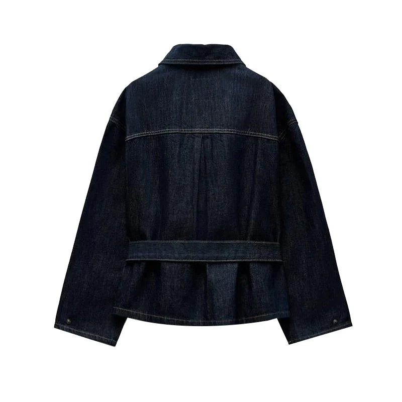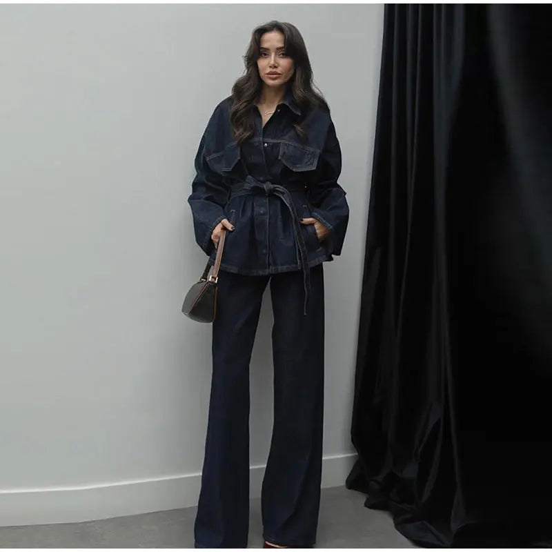 Dit tweedelige denim-look setje is een must-have voor wie houdt van een casual, maar fashionable uitstraling. De getailleerde jas met riem en de rechte broek zorgen voor een moderne, stoere look die je moeiteloos kunt stylen voor elke gelegenheid.