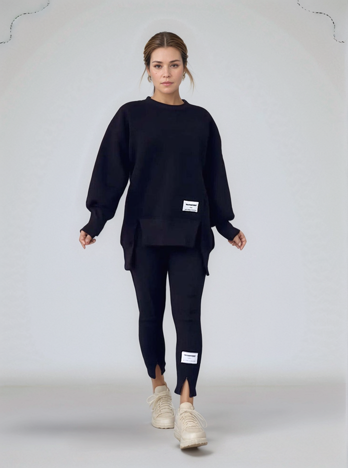 Het sweatshirt heeft een relaxte pasvorm met subtiele oversized accenten, terwijl de leggings een naadloze tailleband hebben die zorgt voor een flatterend silhouet. Dit maakt de set perfect voor zowel ontspannen dagen thuis als casual uitstapjes.